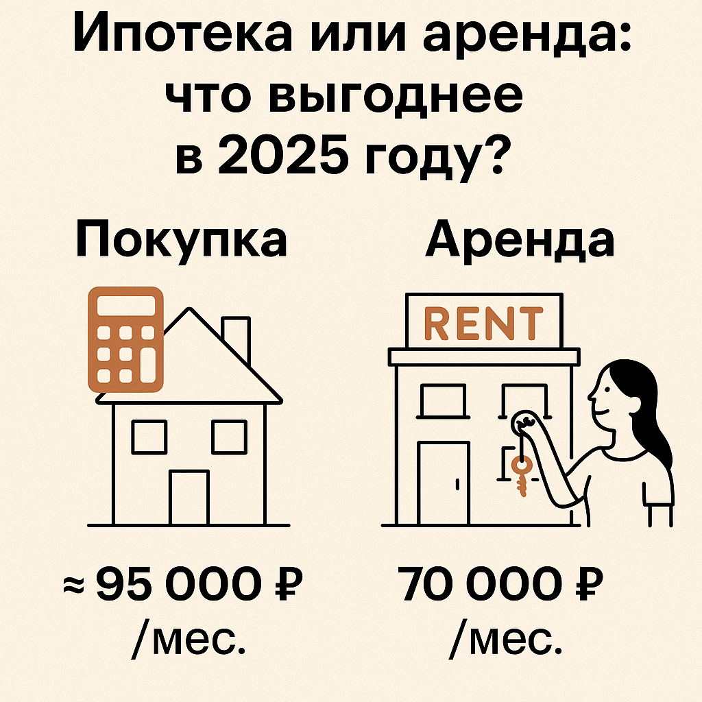 Предположим, вы нашли квартиру за 10 млн ₽. Вносите 20% (2 млн) и берёте ипотеку на 20 лет под 15%: Допустим, вы снимаете аналогичную квартиру за 70 000 ₽ в месяц: Нет универсального ответа. Но ориентир простой: 👉 Хотите гибкость — арендуйте.