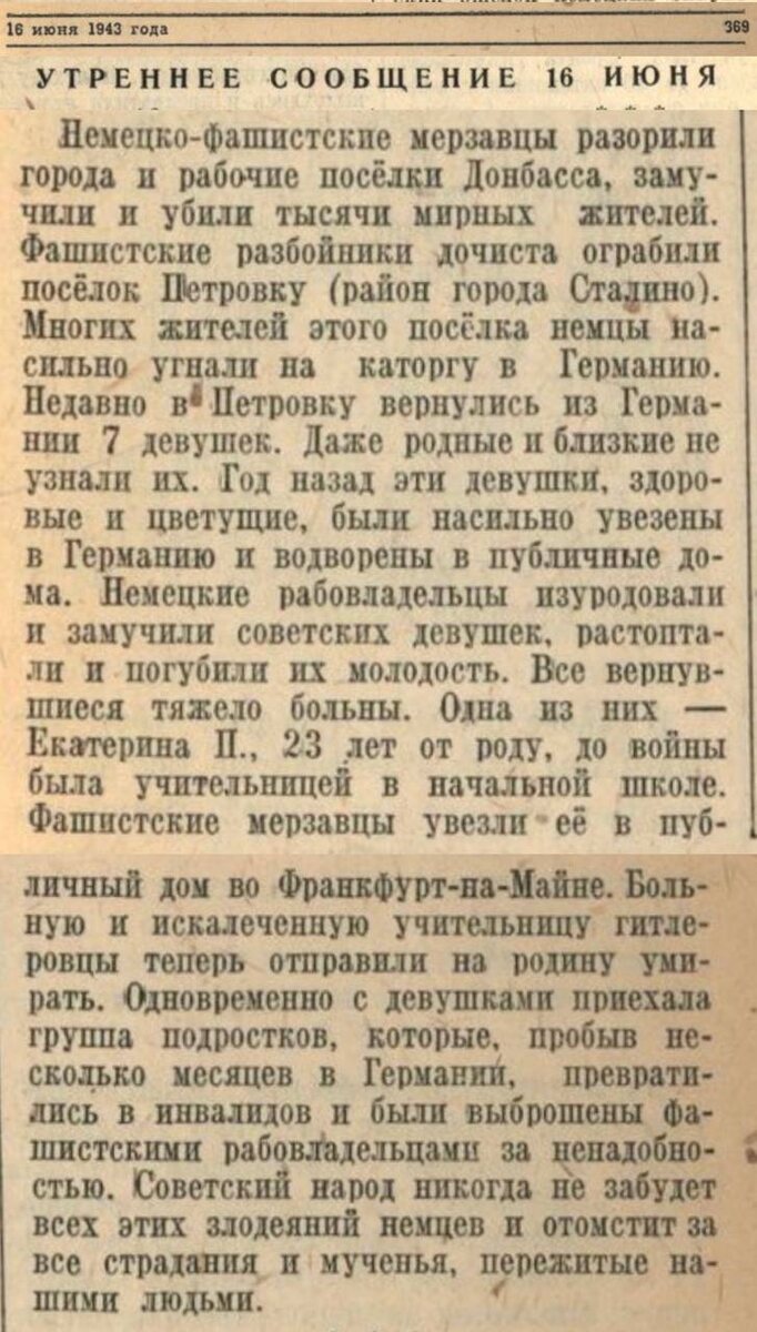 16 июня 1943 года Совинформбюро были приведены свидетельства преступлений, совершённых немецко-фашистскими захватчиками на оккупированной территории Донбасса. "Фашистские разбойники дочиста ограбили посёлок Петровку (район города Стадино). Многих жителей этого посёлка немцы насильно угнали на каторгу в Германию". Семь девушек, насильно вывезенных в Германию, вернулись в Петровку. "Даже родные и близкие не узнали их. Год назад эти девушки, здоровые и цветущие, были насильно увезены и водворены в публичные дома. Немецкие рабовладельцы изуродовали и замучили их, растоптали и погубили молодость". Среди них — 23-летняя учительница Екатерина П. "Фашистские мерзавцы увезли её в публичный дом во Франкфурт-на-Майне. Больную и искалеченную учительницу гитлеровцы теперь отправили на родину умирать". Одновременно с девушками вернулась группа подростков. "Они, пробыв несколько месяцев в Германии, превратились в инвалидов и были выброшены фашистскими рабовладельцами за ненадобностью". Подписатьс