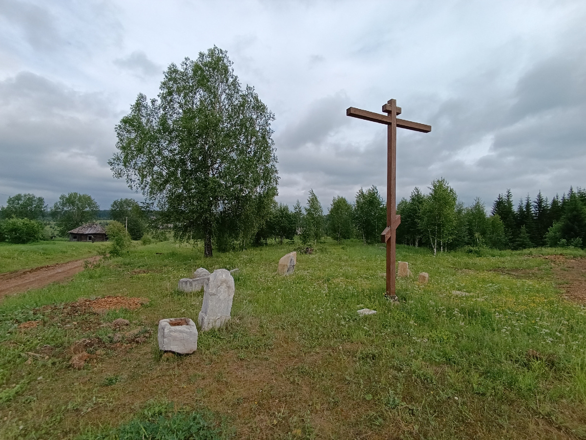 В поселок Промысла мы заехали ради памятника Первому алмазу в России. Недалеко от памятника Первому алмазу в России увидели крест, а рядом много надгробий. Сходила до памятника Первому алмазу и вернулась сюда. Ни таблички, ни стенда - ничего. По какой причине здесь крест - не понятно. До приезда сюда я не вдавалась в подробности истории поселка - знала её достаточно поверхностно - основные вехи (создан как поселок при золотых приисках, потом нашли алмаз, добывали золото и искали алмазы, работали лесопункты, добычу золота прекратили в 1980-х годах, с тех пор поселок стал угасать). Я предположила, что крест установлен либо на месте старого кладбища (ага, на горе над поселком.... логика у меня, конечно, железная), либо на месте, где раньше был храм. Логика (всё же!) не подвела. На этом месте раньше стоял храм. К сожалению, архивных фотографий лишь одна: Больше никаких фотографий я не нашла. На месте храма и установлен крест. Надгробия практически разрушены, надписи читаемы лишь частич