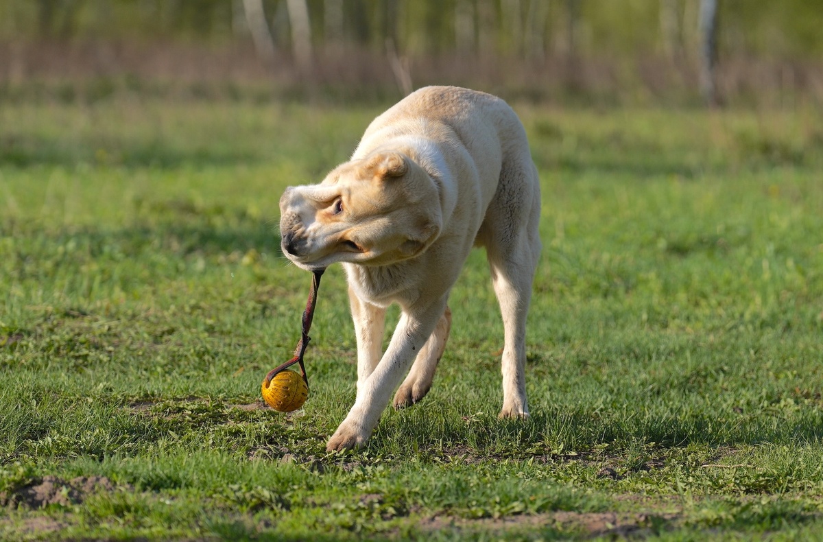 Рав с нетерпением ждал, когда мы вернемся с кормежки. Дождь прекратился, и даже выглянуло солнышко, а значит перед тем, как зайдем домой, можно минут 15 поиграть в мяч с алабайчиком. В футбол или подобие апорта с Равом в основном играет Ваня: у него больше сил, он более профессионально ведет мяч. Но иногда последний может прилететь и мне, и тогда Рав бегает от одного человека к другому в попытках (причем далеко не всегда бесплодных!) забрать свою игрушку обратно. Так произошло и вчера. Причем мяч был особенный, горячо любимый Равом – на веревочке. И я, чтобы не сплоховать и не испортить игру мальчикам, стала раскручивать его, словно заправский метатель молота. Только делала это не вокруг своей оси, снизу вверх, по кругу. Хотела кинуть мячик как можно дальше… И вдруг в какой-то момент он вырвался у меня из рук (и как вы можете догадаться, этот момент был самым что ни на есть неудачным) и улетел. Наверх. И не просто наверх, а на крышу нашего дома. И так ловко там устроился, что даже скат