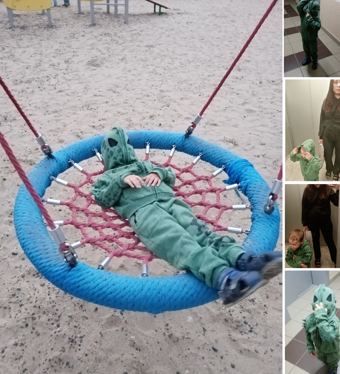 Собрались, дошли до площадки и дождь пошёл. На качельке всё равно успели покачаться. Костюм пришёлся очень даже кстати. Капельки не попадали на лицо.