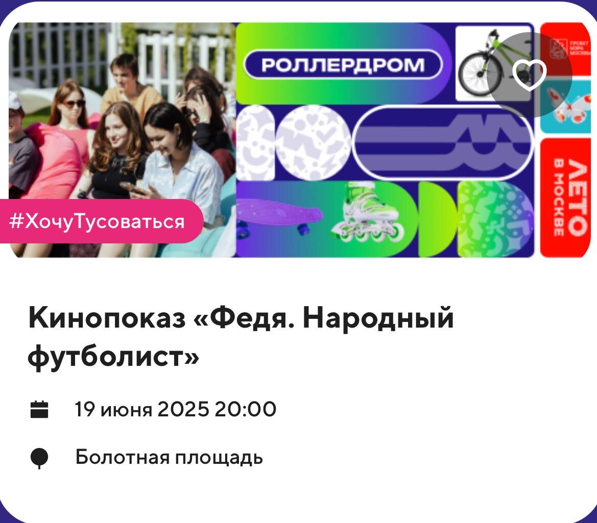 Вечерние киносеансы под открытым небом🍿 Каждый четверг в «Зеленом маркете» проекта «Сделано в Москве» на Болотной площади будут проходить бесплатные кинопоказы 🎬 На этой неделе можно посмотреть фильм «Федя. Народный футболист». 🆓Бесплатно по регистрации Подробнее ЗДЕСЬ 👨👩👧👦 @Together_with_kids Пост носит информационный характер