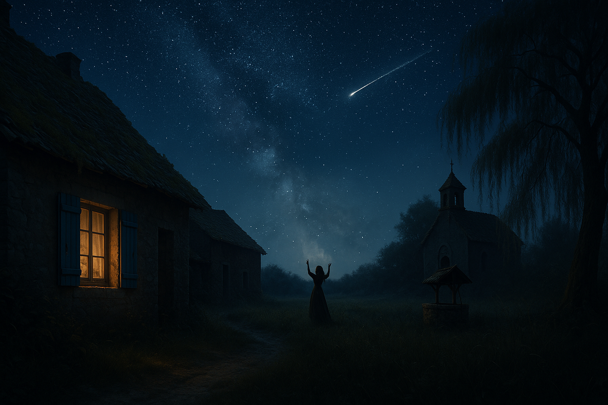 Вдруг Кирик заметил движение на небосводе: одна из звёзд сорвалась и прочертила небесный купол ярким росчерком. На мгновение серебристый след озарил кромку далёкого леса призрачным светом, а затем растаял в темноте. Он невольно улыбнулся — в таких случаях принято загадывать желание.