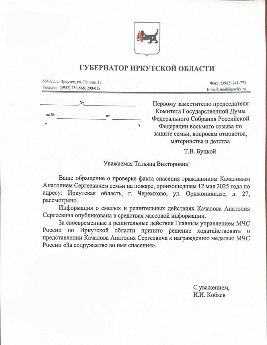 💪 Отважный спаситель многодетной семьи из пожара будет награжден! В СМИ и соцсетях в прошлом месяце появилась информация о том, что житель города Черемхово Иркутской области Анатолий Качалов спас семью с четырьмя детьми из пожара. 👉 Сообщалось, что спаситель возвращался домой с работы и увидел горящую веранду в одном из домов. Он сразу позвонил в пожарную охрану и начал стучать в окна, чтобы разбудить людей. Затем он помог всей семье выбраться из горящего дома через окно. 📨 Узнав о таком отважном поступке, я написала обращение на имя губернатора Иркутской области Игоря Кобзева с просьбой наградить героя. 📩 И вот мне пришел официальный ответ. Из него следует, что Анатолия Качалова представят к награде медалью МЧС России «За содружество во имя спасения». #Депутат_Буцкая