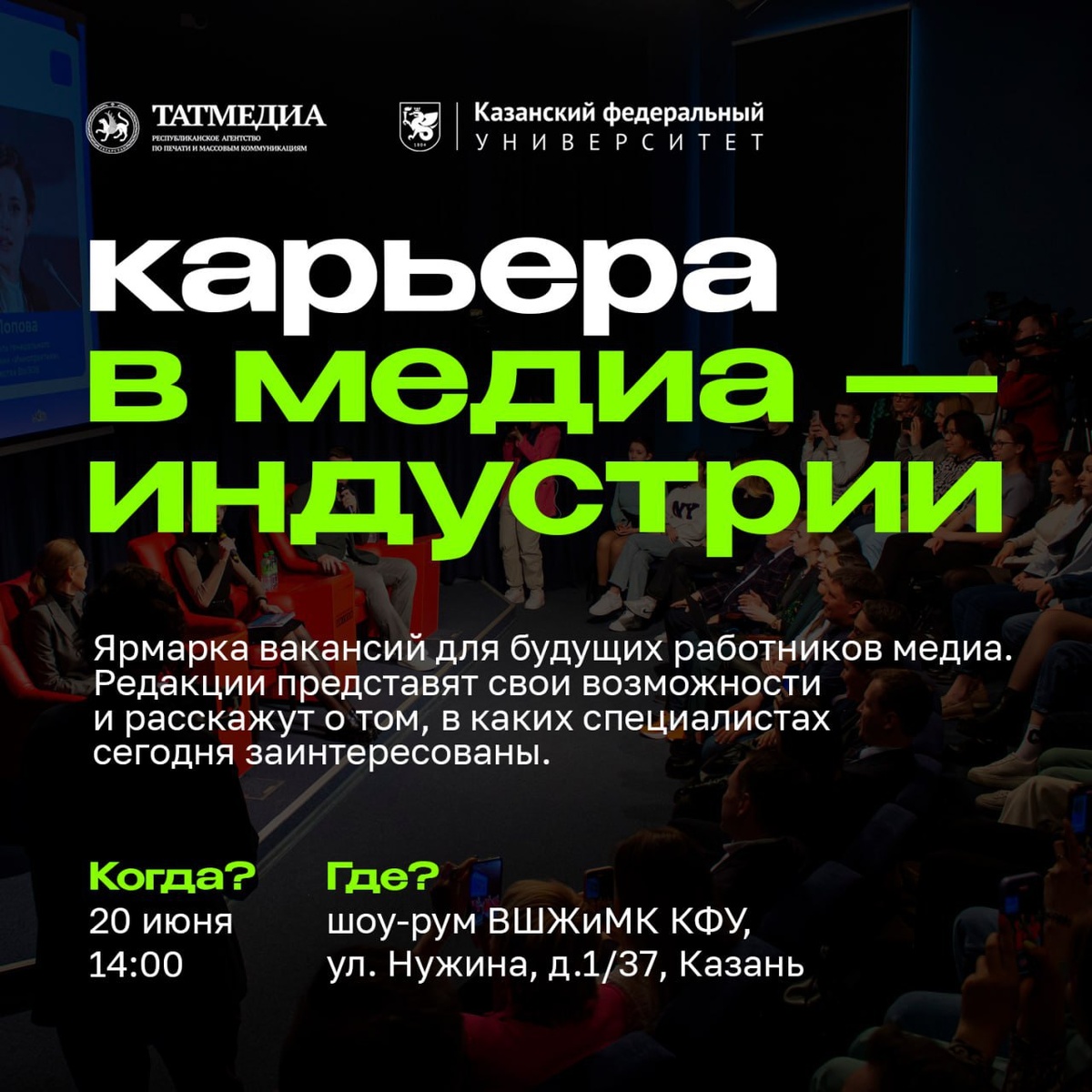 🙋🏻♂️📱Пост для будущих работников медиаиндустрии 20 июня в 14:00 Республиканское агентство по печати и массовым коммуникациям «Татмедиа» совместно с Высшей школой журналистики и медиакоммуникаций Казанского (Приволжского) Федерального университета проведет первую ярмарку вакансий для будущих работников медиа. Встреча пройдет в шоу-руме Высшей школы в формате прямого диалога с ведущими средствами массовой информации Татарстана. Редакции представят свои возможности и расскажут о том, в каких специалистах сегодня заинтересованы. Также предусмотрены самопрезентации от студентов, что поможет им проявить себя и привлечь внимание работодателей. Это отличная возможность для всех, кто хочет построить карьеру в медиаиндустрии. Не упустите шанс узнать больше о профессиях в сфере журналистики и медиакоммуникаций. @tatmediaofficial