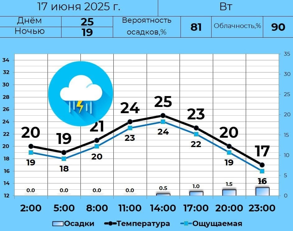 🌡️ Температура: днем +25°C, ночью +19°C (на 3 градуса выше климатической нормы).