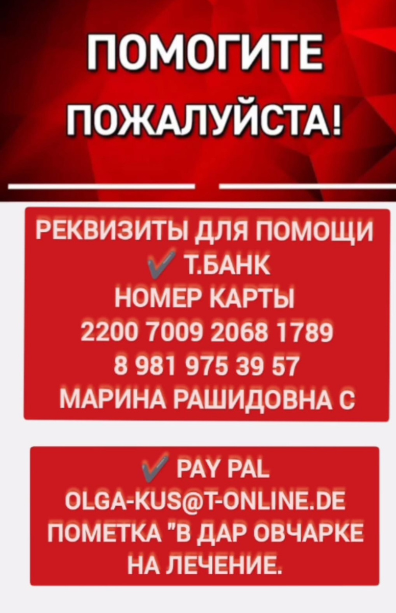 Друзья, SOS! Нам очень нужна ваша поддержка! 🆘 Недавно мы спасли из отлова в Казахстане несколько хвостиков, и среди них оказался молодой овчар. К сожалению, уже при транспортировке мы заметили, что он сильно хромает. Похоже на разрыв связок – ему больно ступать на лапу. 💔 Нам срочно нужна консультация опытного ветеринара! Необходимо понять, насколько серьёзна травма и возможно ли избежать операции. Очень надеемся, что ещё не всё потеряно и мы сможем ему помочь! 🙏 Нам необходима ваша помощь, чтобы оплатить приём, анализы, осмотр и такси до клиники. Ориентировочная сумма сбора – 10 000 рублей. 5000 на такси в две стороны. Пожалуйста, не останьтесь равнодушными! 🙏 Помогите нашему мальчику снова бегать и радоваться жизни! Мы обещаем держать вас в курсе всех новостей о его состоянии. 🐕 Каждая ваша копейка – это шанс для него! ❤️ Помогите овчарке! 🙏 Такси, анализы, тесты, операция, стационар, капельницы. Реквизиты для помощи ✔️ Т.БАНК НОМЕР КАРТЫ 2200 7009 2068 1789 8 981 9