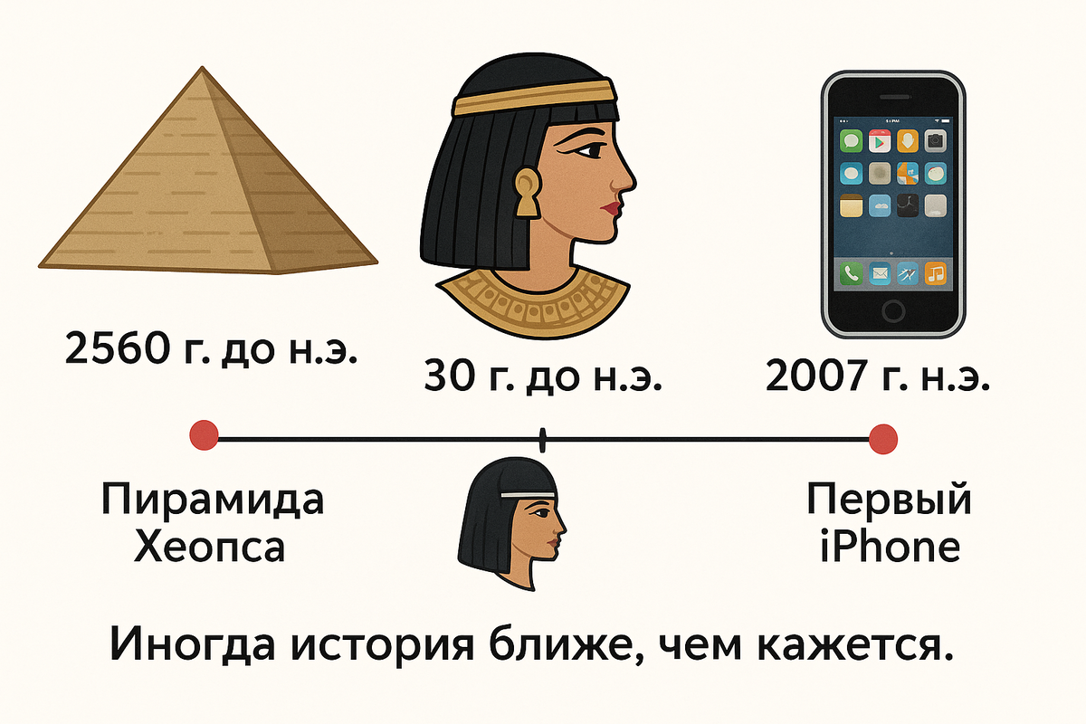 Когда слышишь слово «Клеопатра», в голове сразу возникают образы пирамид, фараонов и песков пустыни. Удивительно, но это довольно распространённое заблуждение. На самом деле, между жизнью Клеопатры и строительством пирамид лежит не одно столетие, а почти два с половиной тысячелетия. А вот до изобретения айфона — всего две тысячи лет. Парадокс, правда?