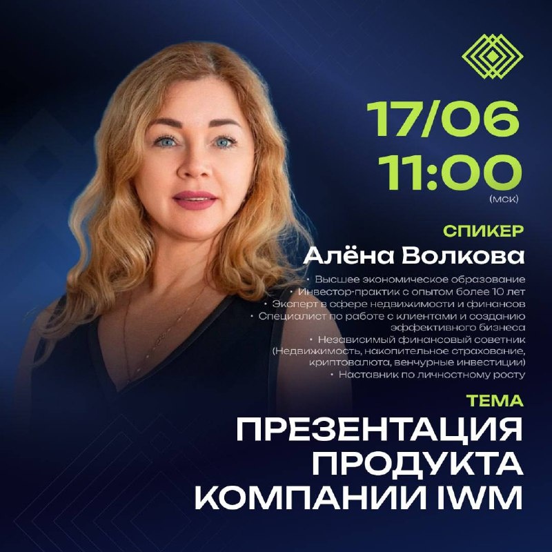 ⚡️ПРИГЛАШАЕМ ВАС НА ПРЕЗЕНТАЦИЮ INFOWAYMARKETING CO.L.L.C. (IWM) ⚡️ 📝СПИКЕР: Алёна Волкова ЛИДЕР КОМПАНИИ! - Высшее экономическое образование - Инвестор-практик с опытом более 10 лет - Эксперт в сфере недвижимости и финансов - Специалист по работе с клиентами и созданию эффективного бизнеса - Независимый финансовый советник (недвижимость, накопительное страхование, криптовалюта, венчурные инвестиции) - Наставник по личностному росту Приглашаем всех, кто заинтересован в грамотном инвестировании и развитии! В программе: ✔️ Презентация компании, которая станет вашим надежным партнером в достижении финансового благополучия. ✔️ Всё о возможностях пассивного и активного дохода с компанией INFOWAY. Присоединяйтесь к эфиру, если хотите узнать, как можно заработать вместе с компанией #IWM! 🔗 Ссылка на встречу: https://us06web.zoom.us/j/2116731674?pwd=xahqmhZLmGsNMAcfVYG8sNdiNWlLRY.1