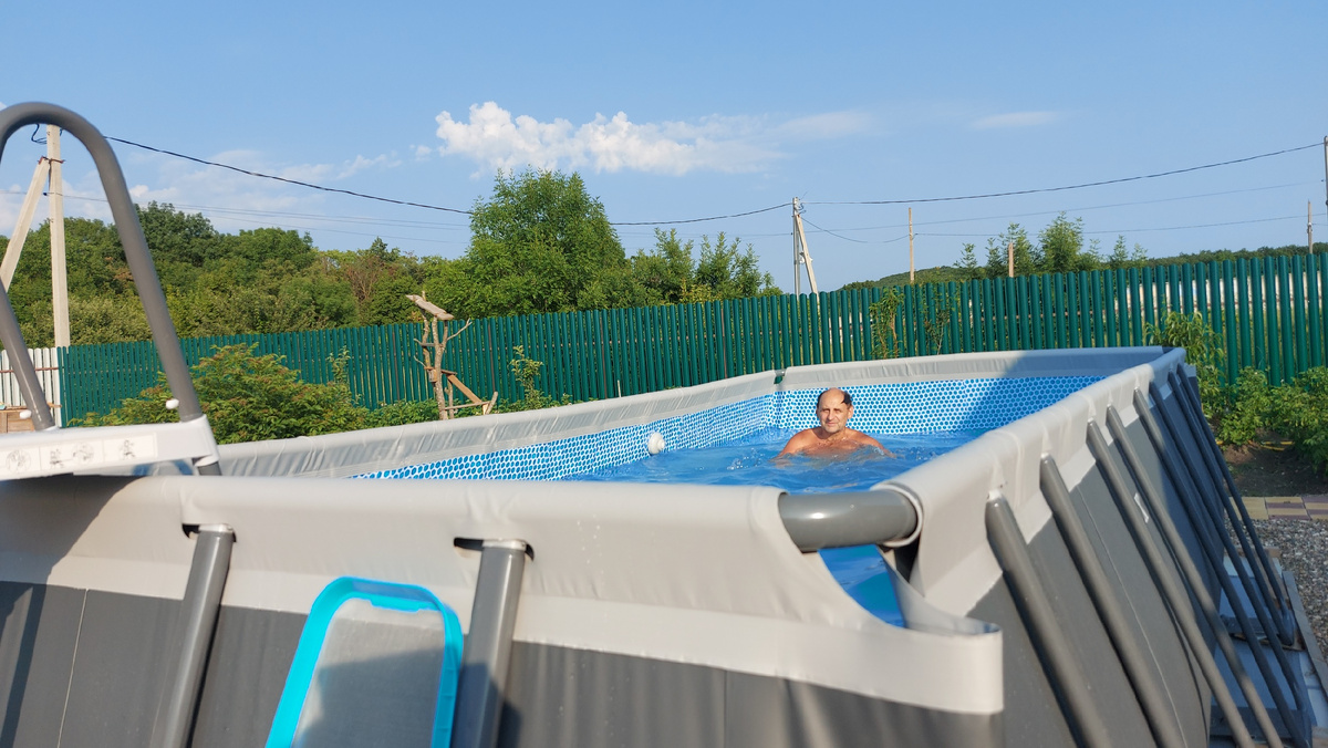Для чистки бассейна применяем раз в неделю жидкость альцигид и постоянно плавает хлорная таблетка в поплавке по воде. При купании в основном поплавок с таблеткой убираем в ведёрочко. Альцигид идёт из расчёта 50 мл на 10 кубов воды. Вода налита уже месяц, температура в бассейне достигала до +29 градусов, и цветения водорослей нет. Единственное, из-за жёсткости воды (в регионе распространены известняки и мергели (те же известняки, только глинистые)) по стенкам выпал мелкокристаллический осадок карбоната кальция, который легко счищается щёткой для бассейна. Один раз добавил медный купорос, что добавило голубой цвет воде и дополнительно продезинфицировало от водорослей и плесени. Раз в месяц можно добавлять и медный купорос, хотя очень хорошо работают хлорные таблетки и альцигид. После купания я прохожу по бассейну и полоскаю полуоткрытый поплавок с хлорной таблеткой по всему бассейну. И потом его оставляю в воде. При добавлении в поплавок хлорной таблетки раз в неделю, в поплавке накап