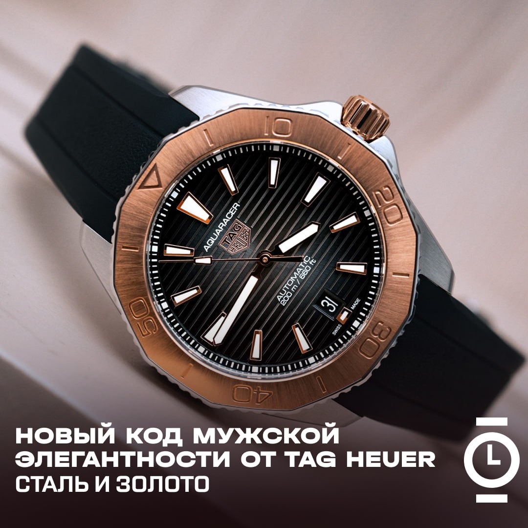 СТАЛЬ И ЗОЛОТО: НОВЫЙ КОД МУЖСКОЙ ЭЛЕГАНТНОСТИ ОТ TAG HEUER #обзор_WD В 2022 году TAG Heuer расширила линейку Aquaracer Professional 200, добавив 40-миллиметровую версию. Это стало важным шагом: коллекция, ранее представляемая только 43 и 45 мм, получила более универсальный размер, сделав часы доступнее для широкой аудитории. В 2024 году на выставке Watches & Wonders компания представила шесть новых моделей с использованием драгоценных металлов, из которых особенно выделяются две двухцветные 40-мм версии — из стали с розовым золотом и стали с жёлтым золотом. В этих моделях используется 18-каратное золото: 5N для розового и 3N для жёлтого. Оно применено в солнечно-матовых вставках безеля и заводных головках, что придаёт часам премиальный вид, не перегружая их внешне. Несмотря на наличие золота, часы не выглядят вычурно и не требуют деликатного обращения. Корпус остаётся спортивным: угловатый, но не агрессивный, с преимущественно сатинированной отделкой, включая золотые элементы. Тол