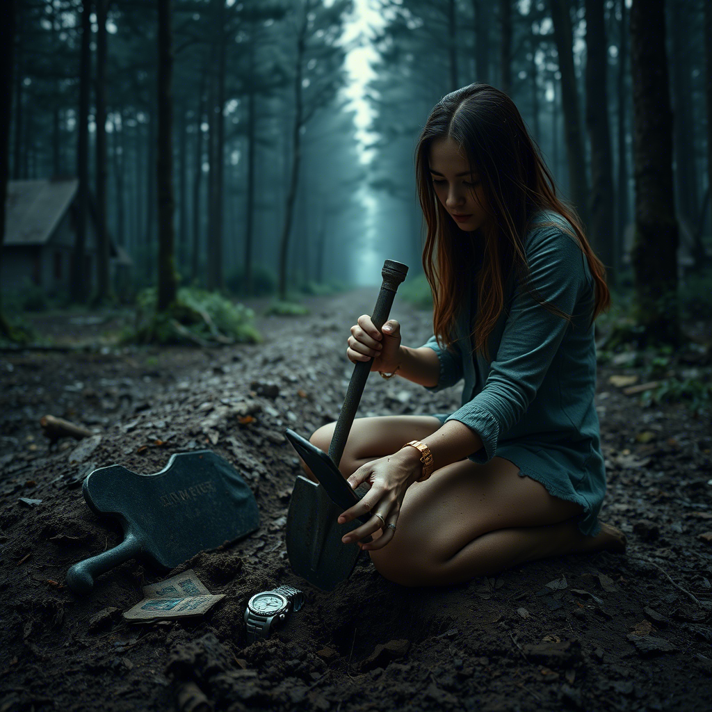 "Я останавливаюсь на окраине деревни. Дома стоят с выбитыми окнами, двери еле висят на скрипучих петлях. Вдруг шорох в кустах. Резко поворачиваюсь — никого. Я здесь не одна…" Начать с Главы 1 Я одеваюсь и беру лопату из кладовки. Сажусь в машину и еду. Деревья за окном сливаются в чёрную массу. Я сворачиваю с трассы на разбитую грунтовку, и цивилизация остаётся позади. Вспоминается отрывок прошлого: мы были здесь с Максимом, его рука лежала на моей талии, смех, запах леса, сосновой смолы. Я останавливаюсь на окраине деревни. Дома стоят с выбитыми окнами, двери еле висят на скрипучих петлях. Вдруг шорох в кустах. Резко поворачиваюсь — никого. Я здесь не одна… Двигаюсь интуитивно, ноги сами несут меня в лес. Вдруг вижу яму. Свежую, аккуратную, будто специально подготовленную. Рядом нет лопаты. Начинаю копать. Вскоре чувствую, что наткнулась на что-то мягкое. Падаю на колени и продолжаю рыть руками. Грязь забивается под ногти, земля пахнет сыростью и... металлом. Пальцы касаются ткани. —