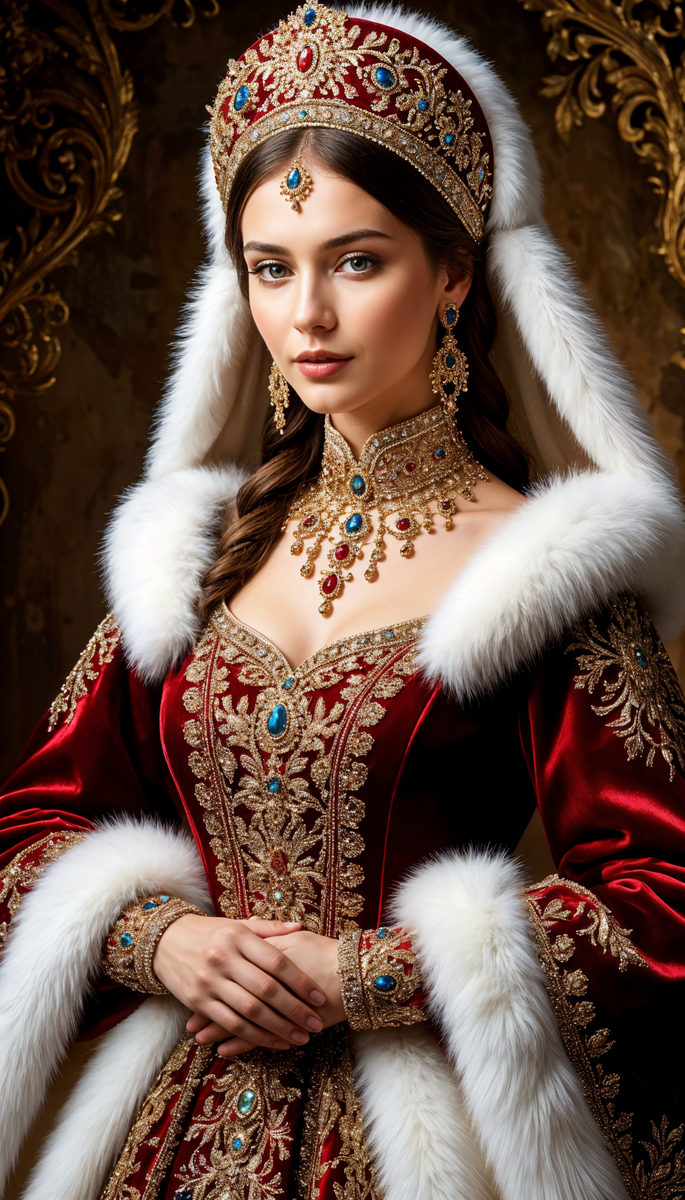 Русская красавица в богатом бархатном наряде, техника позолоты Keum Boo, белый мех, эффект цифрового свечения, эффект искры, опушка на платье по диагонали, шедевр, высокая детализация, высокое качество P.S. Приглашение на Мастер-Классы по изучению Топовых Нейросетей, где Вас ждут Бонусы и Подарки: <<<Участвовать Бесплатно>>>
