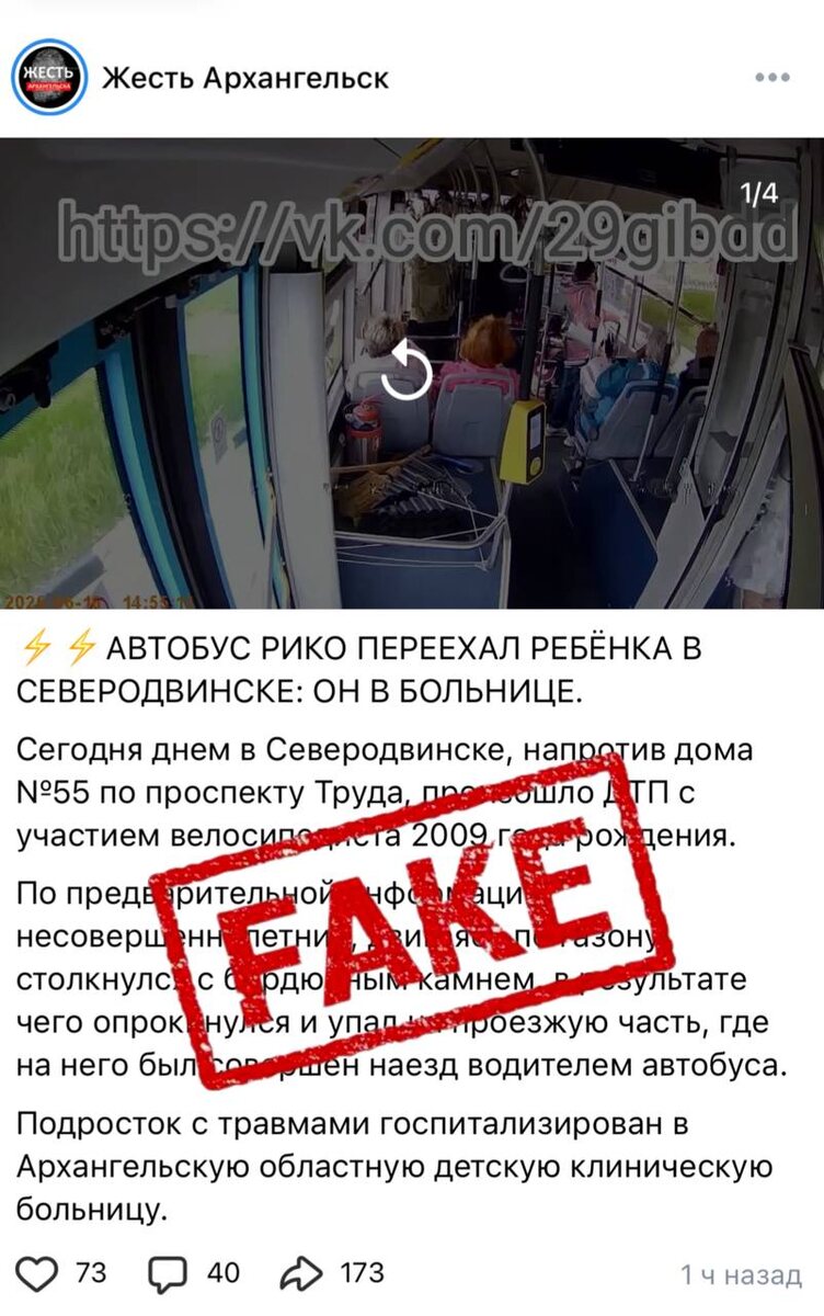 ❗️📣📣📣 Каждый 2-й пост группы «Жесть Архангельск» (и дублирующая группа «Мой город-Архангельск») не соответствуют действительности. ⠀ Сегодня в Северодвинске на мосту велосипедист врезался в буквальном смысле этого слова в автобус маршрута №104. ⠀ Ранее также эти ресурсы распространяли ложную информацию про ДТП с велосипедистом. ⠀ Мы неоднократно уже сообщали, что в группе «Жесть Архангельск» (и дублирующая группа «Мой город-Архангельск») искажаются очевидные факты и официальные сообщения оперативных служб и распространяется недостоверная ложная информация.