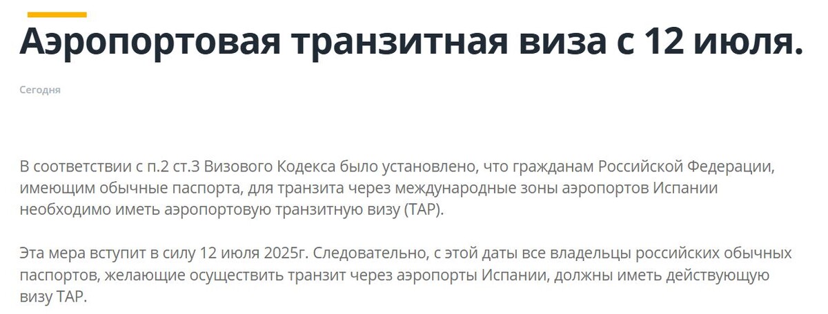 Испания будет требовать транзитные визы (тип «А») с 12 июля