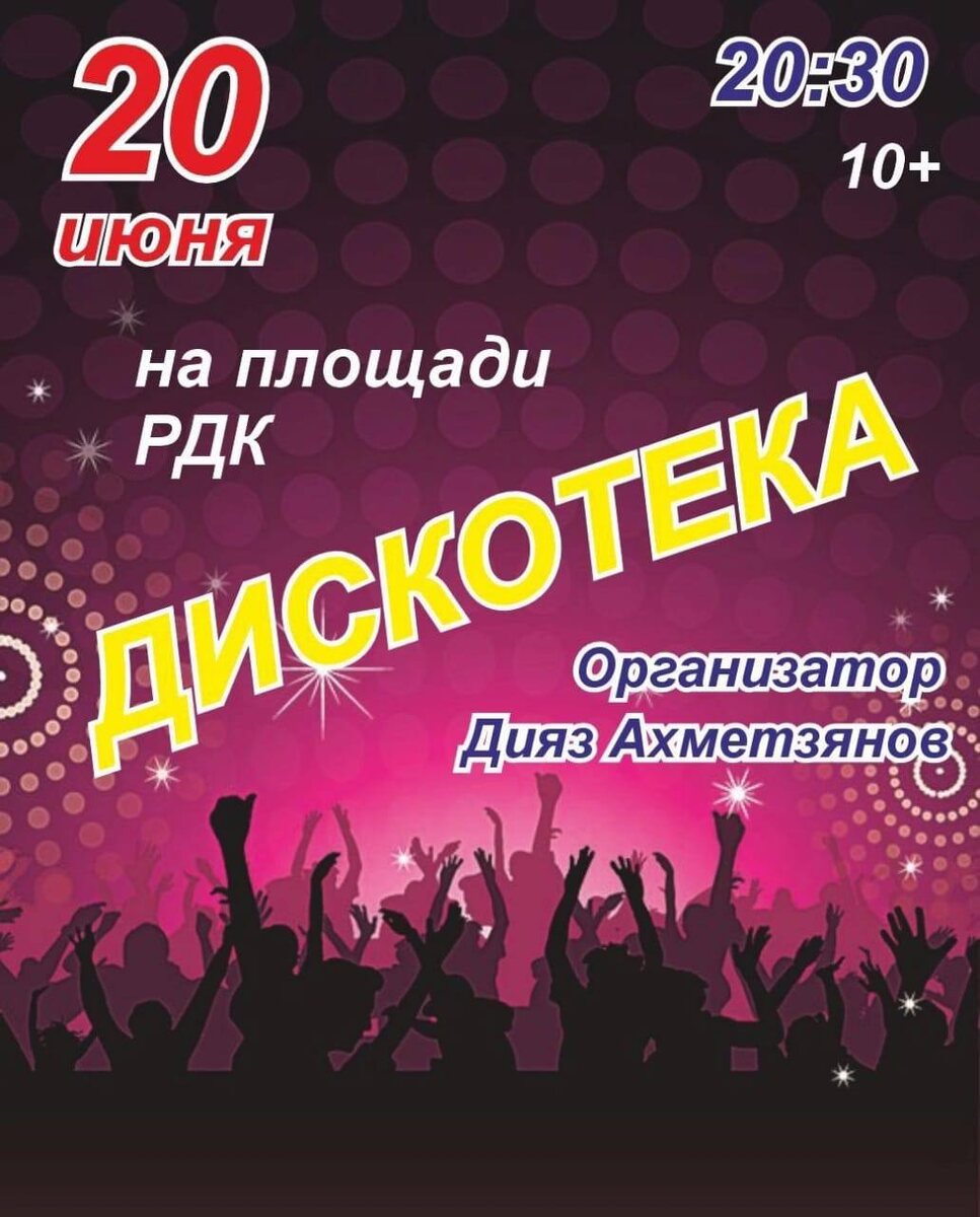 🔥 Главная дискотека лета — ты готов?🔥 📅 20 июня ⏰ 20:30 📍 Площадь РДК (Дрожжановский район) 💿 Мощная аппаратура, которая раскачает весь район! 🎉 Возраст: 10+ — веселье для всех! Организатор Дияз Ахметзянов обещает — будет жарко!🌶️💃 Не пропусти — зарядим энергией вместе! 🚀 #ДрожжановскийРайон #Дискотека2025 #ТанцыДоУтра #РДК #ЛетоВПолномРазгаре