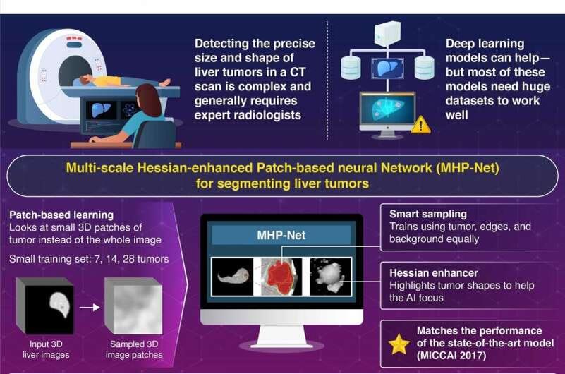 Рак печени занимает шестое место по распространенности среди онкозаболеваний в мире и является одной из ведущих причин смерти от рака. Точное определение границ опухолей (сегментация) критически важно для лечения, но ручной анализ снимков радиологами трудоемок и зависит от их опыта. ИИ-модели, основанные на глубоких нейронных сетях, автоматизируют этот процесс, но требуют огромных объемов данных для обучения (тысячи случаев), что ограничивает их применение. Методы исследования Команда под руководством Кенджи Судзуки (Kenji Suzuki), научного сотрудника, и аспирантки Юцяо Ян (Yuqiao Yang) из Биомедицинского исследовательского подразделения ИИ Института Токио (Biomedical AI Research Unit of Institute of Science Tokyo), Япония, разработала революционную модель MHP-Net (Multi-scale Hessian-enhanced Patch-based Neural Network). Архитектура работает следующим образом: Результаты исследования Исследование, опубликованное в журнале «IEEE Access», показало выдающиеся результаты: Значение и персп