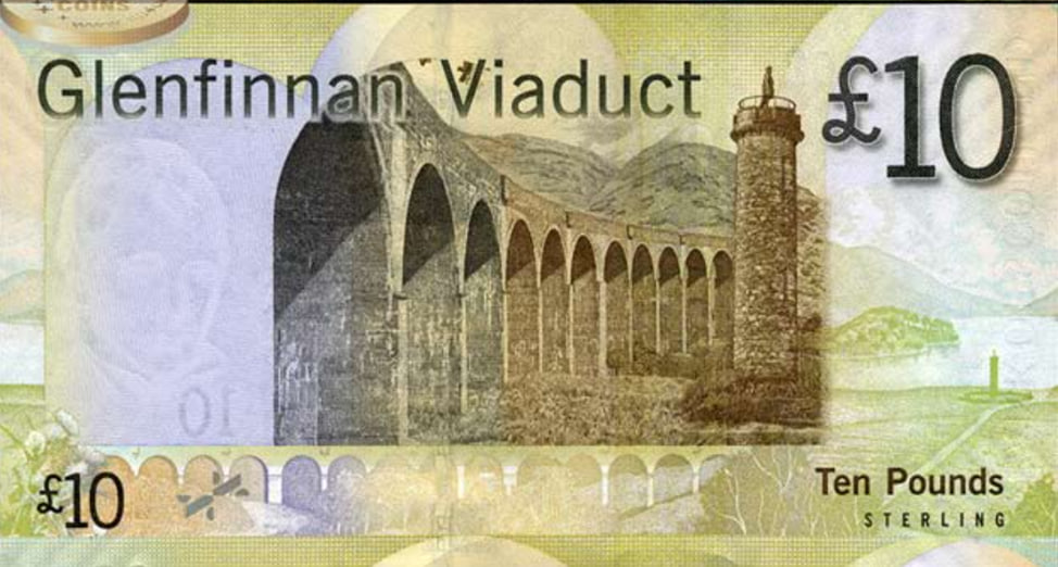 Мост Гленфиннан, изображённый на шотландской банкноте 10 фунтов стерлингов серии «Мосты» (2017 г.)