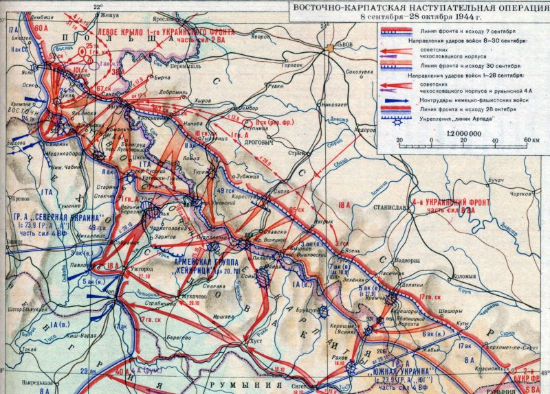 ...она вступает на территорию разных государств: в первом случае – Чехословакии, во втором – Венгрии. Примечание «границы даны на 22 июня 1941 г.» справедливо. Советский Союз признал и первый венский арбитраж, и независимость Словакии, но после нападения стран оси на СССР это признание было фактически отозвано. Так что, согласно официальной позиции Москвы, Красная армия вступала в Чехословакию, а фактически красноармейцы оказались в Венгрии. 1-я венгерская армия билась на своей территории и билась отчаянно, но все же была разгромлена.