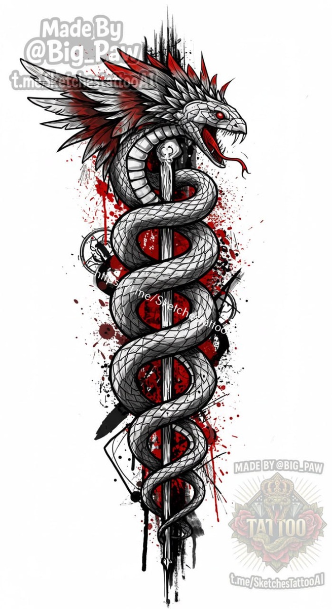 #2521 Подборка по запросу подписчика - эскиз - символ парамедика (одна змея обвивающая посох - символ Асклепия), но чтобы змея была ацтекским Кэтцалькоатлем? В черном исполнении с красными деталями 🧠 SYNTX 💳 Донат 😎 НейроБро 😎 Эскизы без вотера 💀 Эскизы от нейросети #асклепий #медецина #змея #эскизы #тату #татуировки