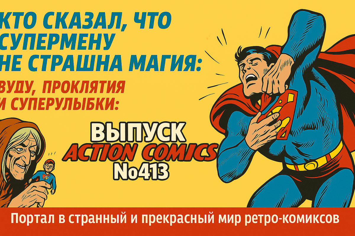 Action Comics #413 вышел в июне 1972 года. Цена — 25 центов, за что вы получали целых 52 страницы историй. Да, раньше комиксы были как воскресное кино — и страшно, и весело, и с юмором. Когда я впервые увидела эту обложку, что-то в ней всколыхнуло тревожное чувство. Супермен — всесильный, летающий, непробиваемый — корчится от боли, а внизу его уменьшенную копию сжимают страшные старческие пальцы. Это не суперзлодей из лаборатории, это ведьма, магия, вуду — всё, чему научная фантастика обычно не придаёт значения. Но в этом выпуске всё иначе. Супермен начинает внезапно страдать от необъяснимой боли. Как будто его душат невидимые руки. На помощь не приходит ни сила, ни интеллект. Он в ловушке.