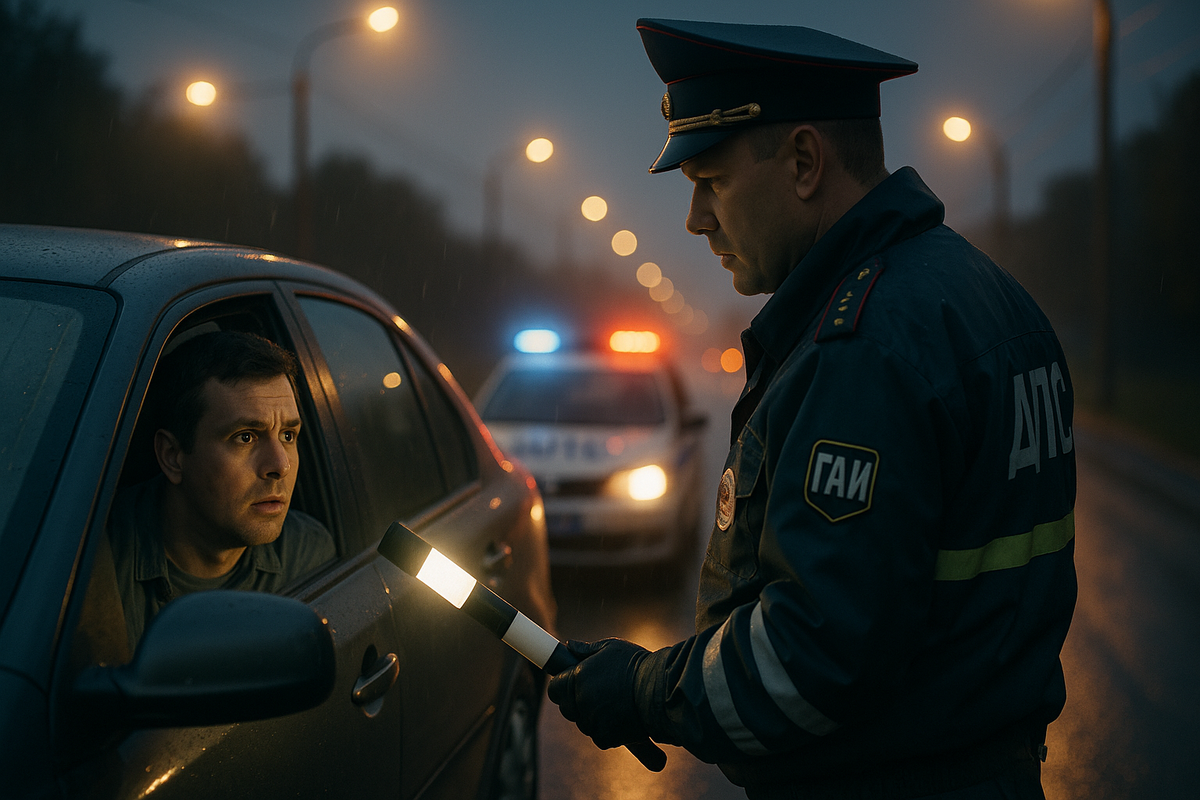 Дорога пустая, впереди — только фонари. И тут — вспышка маячков. Его тормозят сотрудники ДПС.