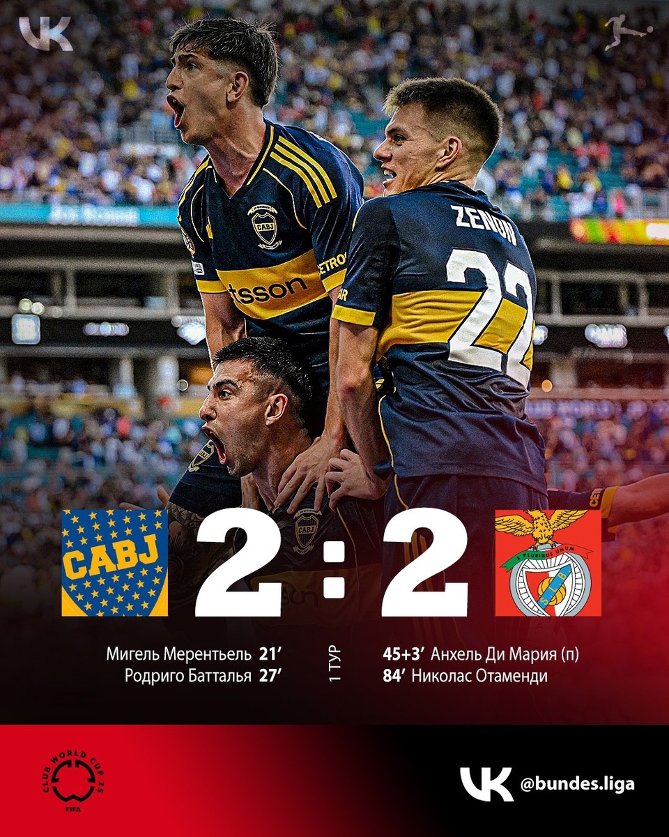 Три удаления и камбэк... не зря имя арены «Хард Рок» 🔥🔥🔥 У «Баварии» какие-то дёрганные соперники по группе. С нервами у этих команд явно проблемы! Рекомендуем игрокам попить чай с шалфеем или цветами лаванды 🤣 Португальская «Бенфика» отыгралась с 0:2, но не победила «Боку Хуниорс» в матче КЧМ с тремя удалениями 🚫🚫🚫 Матч первого тура клубного чемпионата мира между «Бока Хуниорс» и «Бенфикой», который проходил на стадионе «Хард Рок» в Майами (США), завершился со счётом 2:2. 👉На 45-й минуте испанский полузащитник «Боки» Андер Эррера получил красную карточку. У «Бенфики» словил красную на 70-й минуте итальянский нападающий Андреа Белотти. В концовке встречи защитник аргентинцев Николас Фигаль был удалён с поля за грубый фол... Следующий матч «Бока Хуниорс» проведёт с «Баварией» 21 июня. «Бенфика» же встретится с «Окленд Сити» 20 июня #FIFACWC