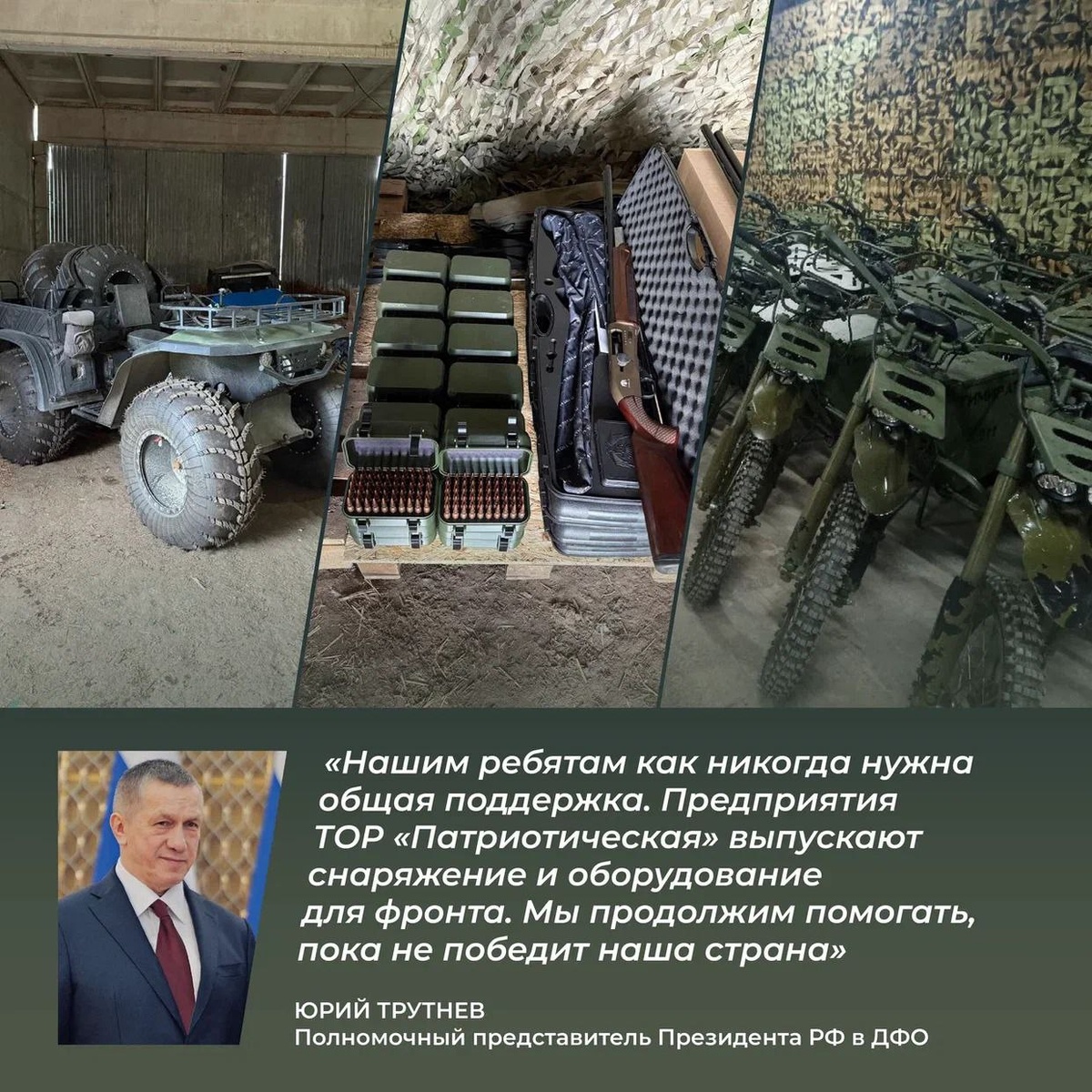 Полномочный представитель Президента РФ в ДФО точно знает чем и как можно поддержать наших ребят-участников СВО. Вице-премьер передал нашим бойцам несколько тысяч единиц техники - вооружение, обмундирование, транспорт от неравнодушных дальневосточников и предприятий ТОР «Патриотическая». Юрий Трутнев: «Нашим ребятам как никогда нужна общая поддержка. Мы вместе. Мы рядом. Предприятия ТОР «Патриотическая» выпускают снаряжение и оборудование для фронта. Мы продолжим помогать, пока не победит наша страна» Наши воины, находящиеся на передовой получили: 🔸FPV-дроны от якутских и забайкальских производителей, 🔸электрические мотоциклы эндуро «Тимир АТ» из Якутии, 🔸снегоболотоходы повышенной проходимости от «ЯКТ-Сокол», 🔸наземные робототехнические комплексы «Курьер» из Бурятии, 🔸промышленные дроны, оснащенные тепловизионной и цифровыми камерами, 🔸гладкоствольные ружья для борьбы с вражескими дронами и боеприпасы к ним. В ДНР Юрий Трутнев провел встречу с командным составом Восточного в
