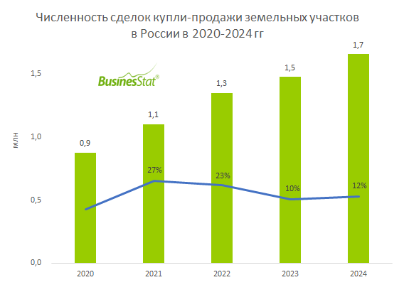 По данным «Анализа рынка продаж земельных участков в России», подготовленного BusinesStat в 2025 г, в 2020-2024 гг численность сделок купли-продажи земельных участков в стране увеличилась на 89%: с 0,9 до 1,7 млн.