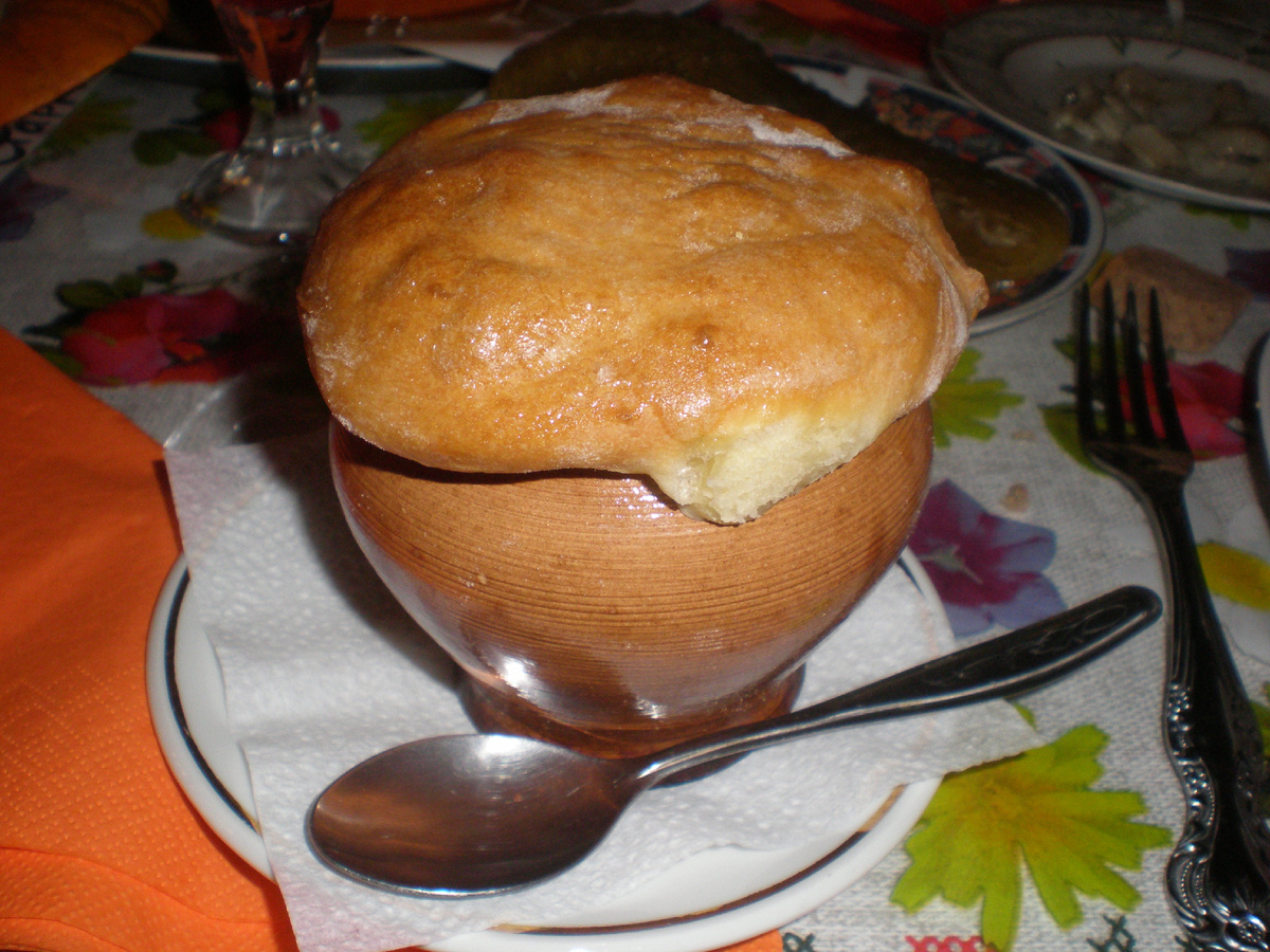 Фото здесь мое , но готовила не я , а угощали этим меня . Щи в духовке под хлебной крышечкой . Я помню , что в деревне давно- давно , в моем детстве , так тоже делали , только крышечка из ржаного хлеба была и горшок большой на всю семью . И крышку эту делили всем , со щами есть .