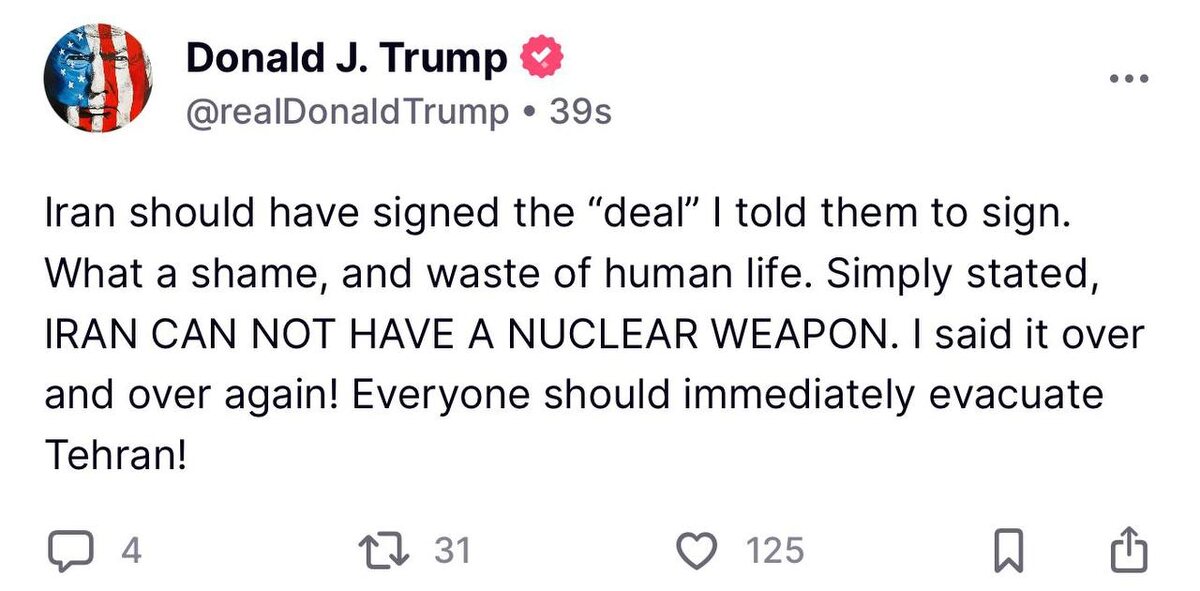 BREAKING: US President Trump says ‘everyone should immediately evacuate Tehran