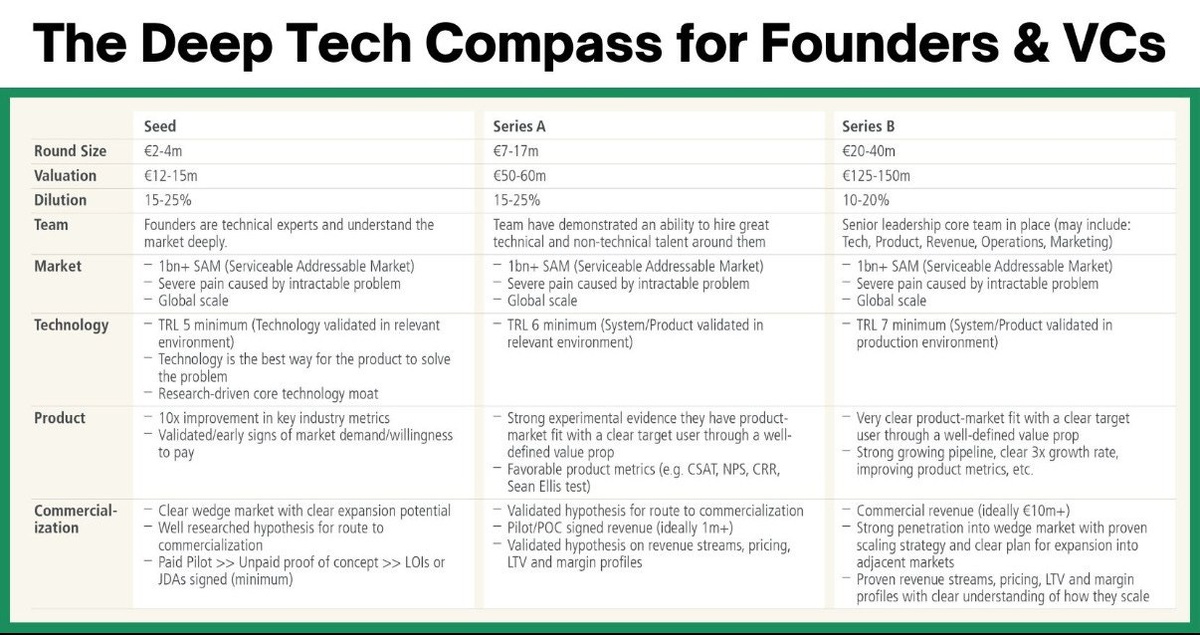 🧭 The Deep Tech Compass – your go-to for quick project metrics & evaluations on a napkin. Let’s stash this gem in our library! Perfect for founders and VCs diving into DeepTech. Hugo Rauch whipped up a handy chart outlining metrics and KPIs for startups at various stages: 🌱 𝗦𝗲𝗲𝗱 → €2–4M round size | €12-15M valuation → Founders are tech whizzes 💡 → TRL 5+: tech validated in relevant conditions → 10x boost in key industry metrics 📈 🌿 𝗦𝗲𝗿𝗶𝗲𝘀 𝗔 → €7–17M round size | €50-60M valuation → Proven ability to hire beyond just techies 👩💻👨💻 → TRL 6+: product validated through real cases → Strong signals of product-market fit (CSAT, NPS, etc.) 🚀 🌳 𝗦𝗲𝗿𝗶𝗲𝘀 𝗕 → €20–40M round size | €125-150M valuation → A top-notch team across all areas 🏆 → TRL 7+: validated under production conditions → 3x growth and a solid client pipeline 🌊 Check out the full details in the attached chart! 📊