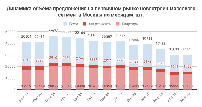 Спрос на массовые новостройки Москвы в мае стал минимальным с августа прошлого года, при этом предложение и средняя цена 1 кв. метра «первички» в целом остались стабильными. Аналитики компании «Метриум» подвели итоги мая на первичном рынке массового сегмента Москвы. Объем предложения за месяц вырос на 0,9%. Средневзвешенная цена квадратного метра составила 352 220 руб. (+0,5% за месяц, +2,5% за год). Было заключено 2 тыс. ДДУ (-23,5% за месяц, -37,2% за год). По данным «Метриум», в мае 2025 года на рынке новостроек массового сегмента экспонировалось 15,2 тыс. лотов (+0,9% за месяц, -26,1% за год) в проектах, где 13,2 тыс. – квартиры (+1,5% за месяц, -24,0% за год) и 2 тыс. – апартаменты (-2,6% за месяц, -37,5% за год). В мае 2025 года на рынке массовых новостроек не стартовал ни один проект. По подсчетам аналитиков «Метриум», средневзвешенная цена квадратного метра квартир и апартаментов по итогам мая 2025 года составила 352 220 руб. (+0,5% за месяц, +2,5% за год). Средневзвешенная цен