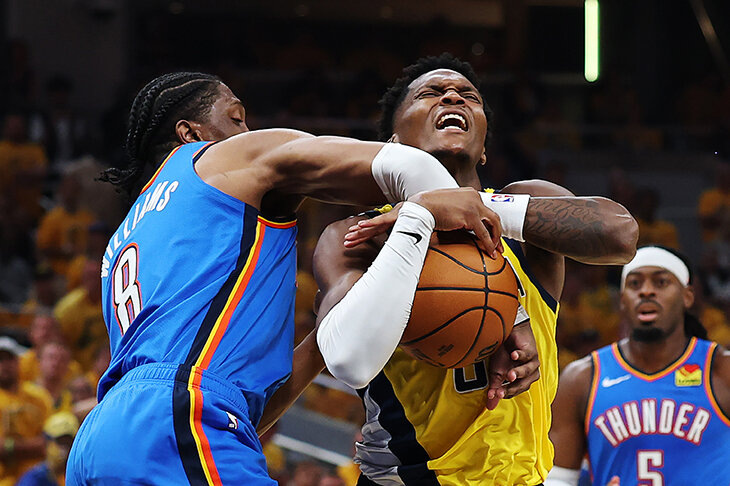 Внутри «Оклахомы»-2025 получается контраст между тонюсеньким Четом Холмгреном под кольцом и танкоподобным Лу Дортом на периметре. Раскачавшегося за три года с дебюта в НБА Джейлена Уильямса тоже сложно продавить. Преодолеть сопротивление обороны «Тандер» на дуге бывает даже сложнее, чем завершить проход под кольцом. Или бывает так – игрок думает, что ему покорилась первая ступень, но сзади или сбоку прилетает пятерня какого-нибудь Алекса Карузо или Кейсона Уоллеса, которая приводит к потере.