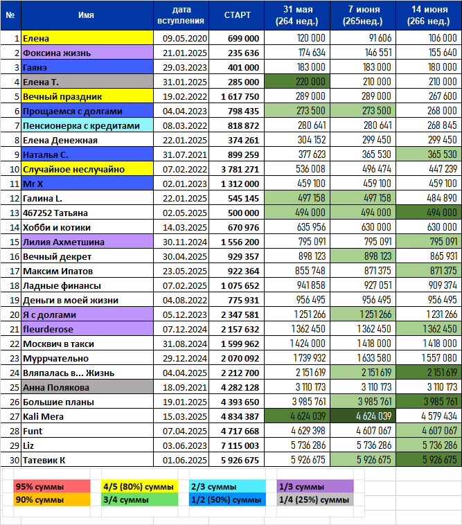 Я исключила из марафона Татьяну Скоробогатову. Она перестала появляться после 17 мая, то есть вот уже месяц. Очень жаль, ведь участник она была очень перспективный: буквально за три месяца погасила 2/3 от долга (была в бирюзовом цвете). Напомню, что в марафон можно вступить снова в порядке общей очереди (которой у нас практически-то и нет), но что-то мне подсказывает, что оставшуюся треть Татьяна погасит уже самостоятельно.