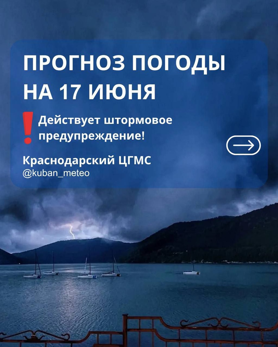 ☁️⛅⛈️ Во вторник атмосферная ситуация в Краснодарском крае останется неустойчивой — через регион продолжат проходить фронтальные разделы. 🌧️ Ожидаются дожди, грозы, местами ливни, град и шквалистый ветер. Будьте внимательны и следите за обновлениями. Специалисты Краснодарского ЦГМС подготовили прогноз погоды на 17 июня 👇🏼 ☁️ В Краснодарском крае — переменная облачность. Кратковременный дождь, гроза, местами сильный дождь, ливень, град и ветер с порывами 20–25 м/с (КМЯ). В отдельных районах — очень сильный дождь, сильный ливень (ОЯ). 🌬️ Ветер западной четверти 5–10 м/с, местами порывы 12–14 м/с. 🌡 Температура воздуха: • ночью +11…+16°, • в юго-восточных предгорных районах +9…+14°, • на Азовском побережье +14…+19°, • днём +22…+27°, • в предгорьях юго-востока +20…+25°, • в горах ночью +3…+8°, днём +8…+13°. 🌊 Черноморское побережье: Переменная облачность, кратковременный дождь, гроза. Ветер западной четверти 6–11 м/с, местами порывы до 14 м/с. Температура воздуха ночью +13…+18°,