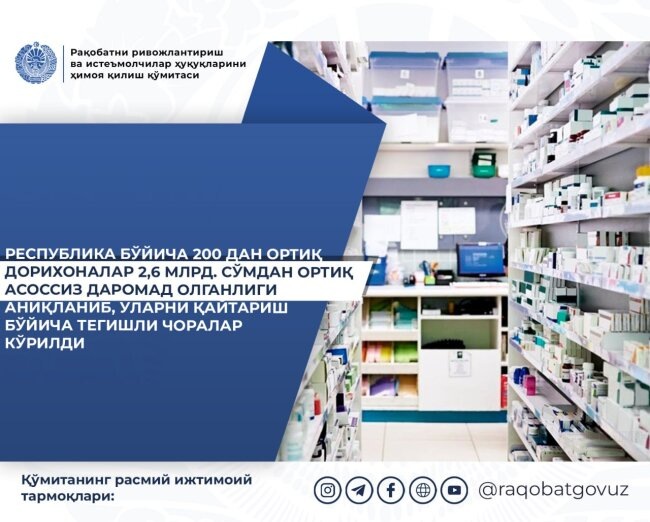 В ходе изучения деятельности аптек, на территории Узбекистана удалось выявить более 1 500 торговых точек, в которых необоснованно завышали стоимость продажи лекарственных препаратов. Их необоснованный доход превысил 14,2 миллиардов сумов. Только за первые 6 месяцев 2025 года удалось выявить 62 704 случая завышения стоимости лекарственных препаратов в 225 аптеках, что принесло им необоснованный доход, в размере 2,6 миллиардов сумов.