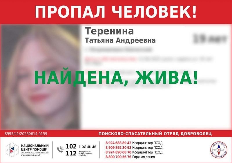На Камчатке завершен поиск пропавшей Татьяны Терениной, девушка жива, передаёт РАИ «КАМЧАТКА-ИНФОРМ» со ссылкой на поисково-спасательный отряд «Доброволец».