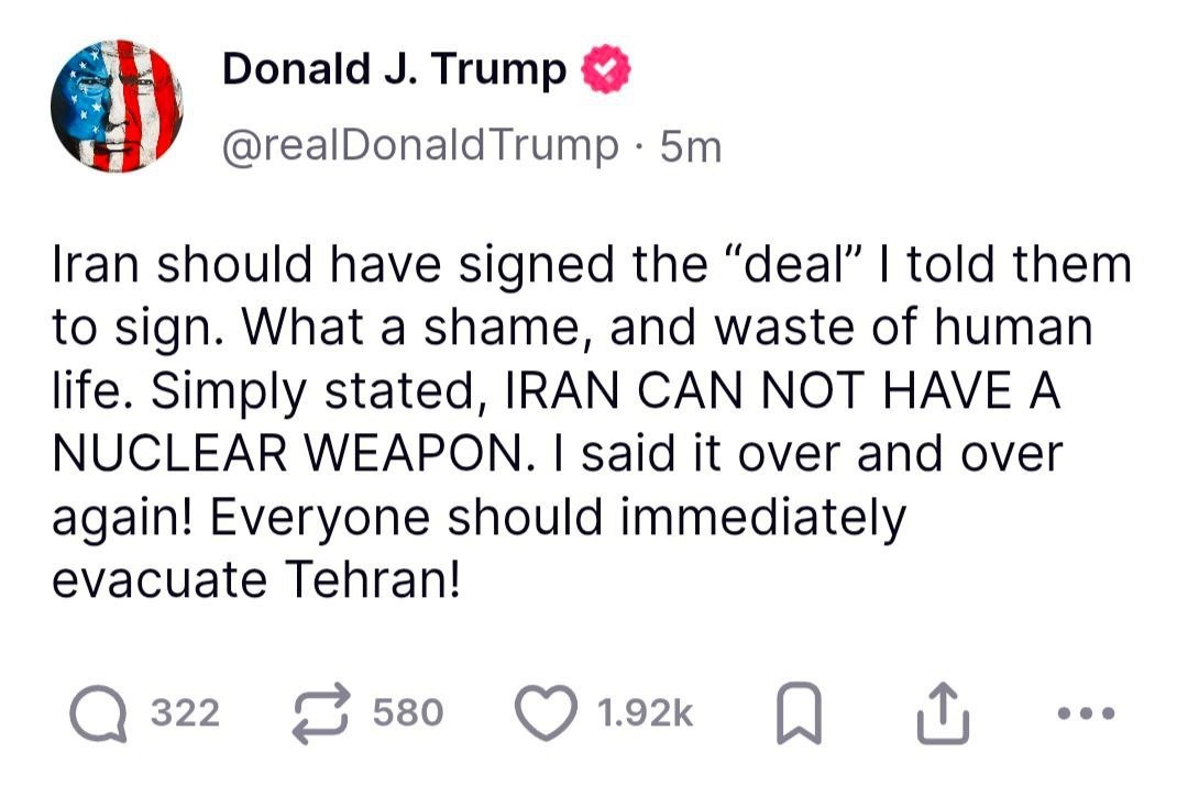 Трамп призвал всех немедленно эвакуироваться из Тегерана