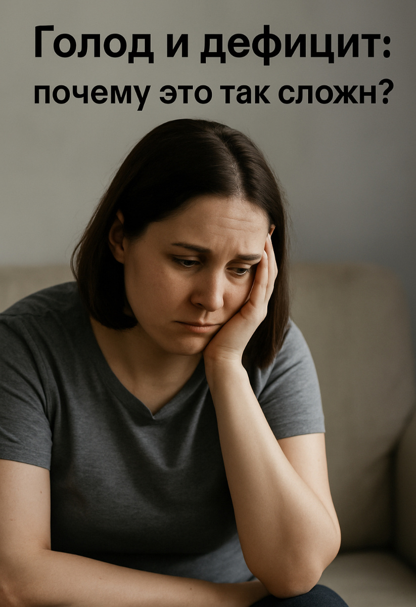🤯 Кажется, всё просто: 📉 Создай дефицит 🍽️ Питайся правильно 🏋️♀️ Тренируйся — и жир уйдёт. Но реальность сложнее. Особенно когда ты уже пробовала диеты, урезания, срывы и качели. Самая большая сложность — чувство голода и контроль дефицита. ⸻ ❓Что важнее — голод или дефицит? Многие уверены: «Просто ешь по голоду — организм знает, сколько ему нужно.» Но правда в другом: 👉 Голод — субъективен. 👉 Дефицит калорий— объективная физиология. ⸻ 💣 Почему на голод полагаться нельзя? Потому что его легко сбивают: – Стресс – Плохой сон – Диеты в прошлом – Отсутствие белка и клетчатки – Перетрен – Нарушенный обмен (метаболическая адаптация) Ты можешь: – не чувствовать голод, но быть в глубоком минусе и сжигать мышцы; – чувствовать голод — и при этом быть в профиците, если еда “пустая”. ⸻ 🔄 Вот где ловушка: Ты не понимаешь, что реально происходит, ориентируясь только на чувства. А потом начинаешь: – бояться еды, – бояться голода, – зацикливаться на калориях и весах. И это может