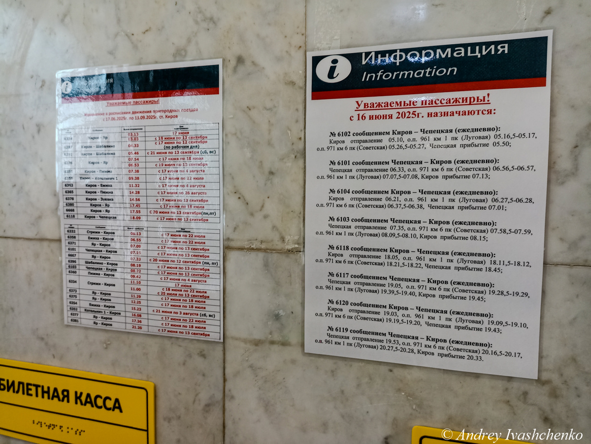 Итак! 16 июня случилось долгожданное событие - запустили электричку между двумя столицами Кировской области из Кирова в Кирово-Чепецк (до станции Чепецкая). Давным-давно электрички уже ходили по данному направлению, была попытка запустить две пары в 2005 г., но вернули в 2025 г. Будучи любителем железных дорог, не мог простить это, и в первый день запуска электрички я решил поехать до станции Чепецкая после работы, так как время позволяло это сделать. Итак! С работы на вокзал. Объявление запуске электрички до станции Чепецкая в пригородной кассе Кировского вокзала. Обновленное расписание. Табло прибытия/отправления поездов. 6 путь станции Киров. Электропоезд ЭД9М-0129 сообщением № 6118 Киров - Чепецкая. В преддверии отправления. Отправление в 18:05. Электричка идет с двумя остановками на платформах в черте Кирова, которые построили недавно. о.п. Луговая (мкр. Корчемкино). Никто не зашел и не вышел. о.п. Советская ("41 микрорайон" Нововятский район Кирова). Здесь тоже не было замечен