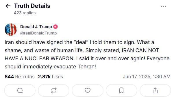 Tramp Tehronni zudlik bilan tark etishga chaqirdi Eron men taklif qilgan “bitim”ni imzolashi kerak edi. Qanday sharmandalik va inson umrini behuda sarflash. Ochiq aytaman: Eron yadro quroliga ega bo‘la olmaydi. Men buni qayta-qayta takrorladim! Hamma zudlik bilan Tehrondan evakuatsiya qilinishi kerak!, deb yozgan AQSH prezidenti X sahifasida. @daryolive