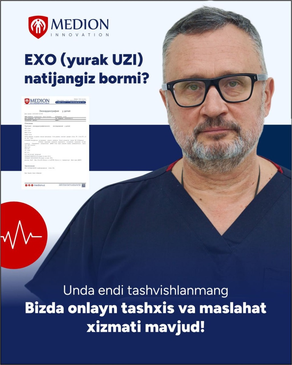 ❤️🩹 Фарзандингиз юрагида шовқин эшитилди — нима қилиш керак? ❗️Ҳеч қандай ваҳимага тушманг! Бу дарров операция дегани эмас! 🩺 Юрак шовқини — баъзида безарар, баъзида эса жиддий туғма нуқсоннинг аломати бўлиши мумкин. Шу боис, аниқ ташхис жуда муҳим! 📌 Энди вақтингизни ва маблағингизни сарфламай, қуйидагича аниқлаб олиш мумкин: 📲 Фақат ЭХО УЗИ (эхокардиография) натижасини @Doctor_Medion га юборинг 📩 1 кун ичида мутахассис кардиохирурглар жавоб қайтаради: – 🟢 операция шартми ёки – 🔵 кузатув етарлими 🔹 100% БЕПУЛ 🔹 Навбатсиз ва тезкор 🔹 Тошкентга келмай туриб! 👨⚕️ Биз билан маслаҳат олиш — фарзандингизнинг келажагини асраш демакдир! 📍"Medion Innovation" клиникаси