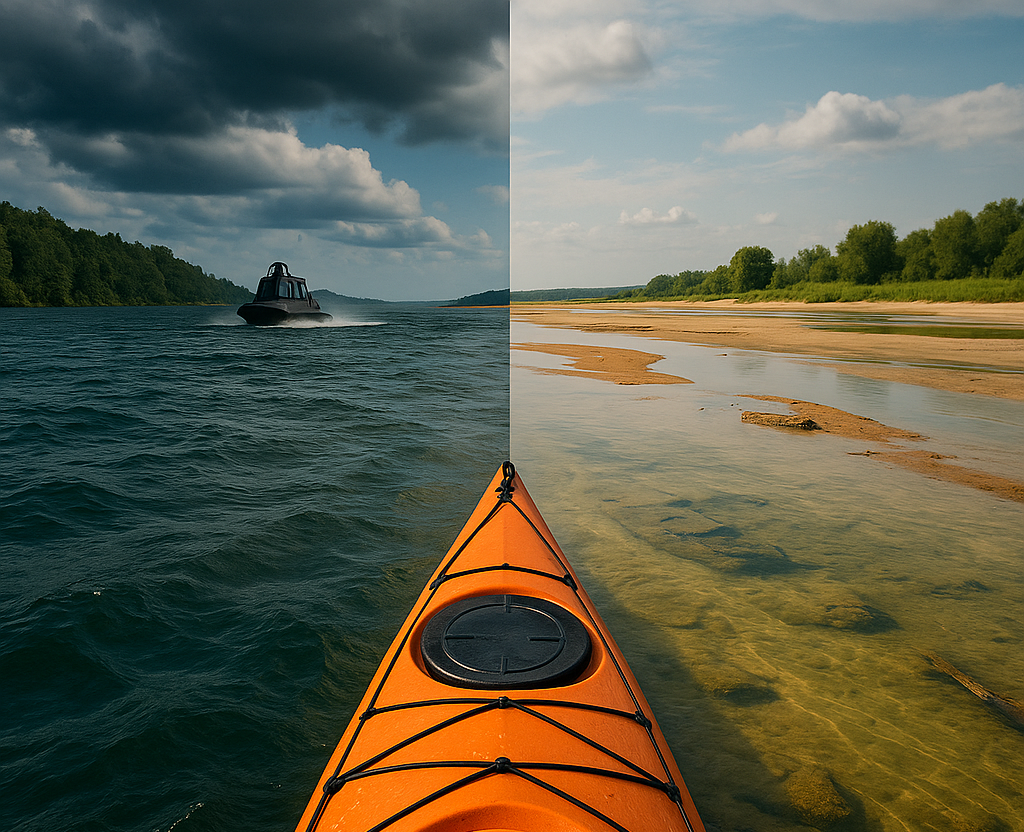 Спустя некоторое время и ещё несколько перекатов, Волга начала неуклонно раздаваться вширь ↔️. Сначала незаметно, потом всё ощутимее. Переплыть от одного берега к другому за минуту стало уже невозможно; приходилось, как ранее на озёрах, срезать путь через середину реки. И вместе с этим исчезло течение. Полностью 😩. Это означало одно: теперь мне нужно грести на несколько часов дольше, чтобы проходить то же расстояние.