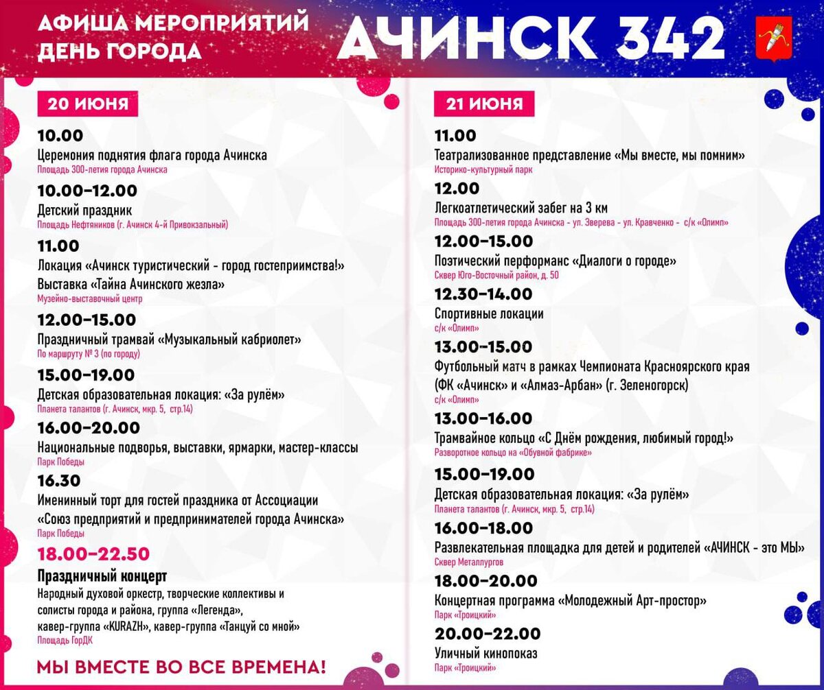 Уже на этой неделе Ачинск отметит 342-ой День рождения! 🥳 Празднование в этом году продлится два дня! Вас ждут увлекательные локации и мероприятия, о которых рассказали в нашей афише. Присоединяйтесь! 💛