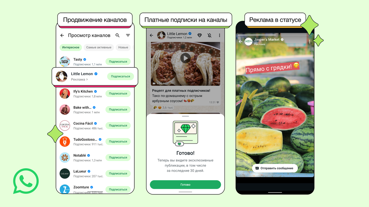 В новой версии WhatsApp пользователи смогут оформлять ежемесячные платные подписки на каналы, чтобы «поддерживать их авторов и получать эксклюзивные обновления», сообщают разработчики. При этом блогерам будет доступно платное продвижение своих каналов через каталог мессенджера. Вице-президент по продукту WhatsApp Элис Ньютон-Рекс сообщила, что Meta в первое время не будет брать комиссию с подписок, но в будущем планирует взимать 10%.