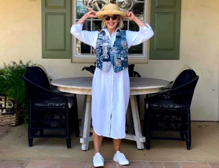 На фото женщина 55+ в стильном летнем образе: свободное белое платье-рубашка создает ощущение свежести и легкости, а фактурный жилет с этническим принтом добавляет индивидуальности и динамики.