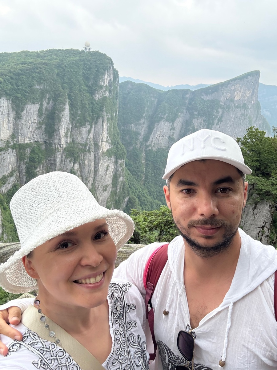 Всё-таки китайцы — очень поэтичный народ. Эта гигантская арка находится в горе Тяньмэнь. Образовалась она в результате то ли землетрясения, то ли естественной эрозии карстовых пород. Высота 131 м, длина 60 м, ширина 57 м. Подняться к ней можно по самой длинной высокогорной канатной дороге в мире. Или по автомобильной дороге с 99 поворотами. Но в данный момент она закрыта. Мы были внутри этой арки. Китайцы, как обычно, адаптировали для людей природную достопримечательность. В основании арки они построили целый этаж, откуда люди фотографируются. Но потолок мешает посмотреть снизу арки на верхнюю её часть. С другой стороны, наверно, они хотели защитить туристов от камнепада. К самой арке можно подняться либо на эскалаторе, либо по лестнице. Либо спуститься одним из этих способов. Но эскалатор платный. Также платными являются стеклянные участки тропы. Ну, мы по одному прошлись. Было уже не страшно. Так что на другие даже не стали смотреть.