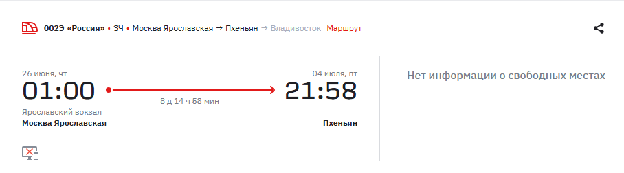 Как было объявлено ранее, в июне 2025 года возобновляются железнодорожные пассажирские перевозки между Пхеньяном и Москвой. Сообщали, что из Пхеньяна – поезда будут отправляться 3-го и 17-го числа с прибытием в Москву 11-го и 25-го числа соответственно, а из Москвы – 12-го и 26-го числа с прибытием Пхеньян 20-го и 4-го числа соответственно. Сегодня, 17 июня, из Пхеньяна должен был выехать первый поезд. Выехал ли? Волнуюсь! Из Москвы первый поезд должен отправиться в четверг, 26 июня. На сайте РЖД билетов на него нет. Или уже разобрали? Судя по номеру поезда 002Э - это поезд Москва-Владивосток, а к нему прицепят вагон до Пхеньяна. Собственно, на сайте Яндекс Расписания так и написано: Номер поезда 652Э - это Уссурийск-Пхеньян. Но на него тоже не могу найти билеты. Ехать на поезде от Москвы до Пхеньяна - 8,5 суток. Наша страна, конечно, большая и интересная, но 8 дней смотреть в окно поезда? Хотя для любителей путешествий по железной дороге на сайте РЖД Тур есть туры на поезде до Иркутс