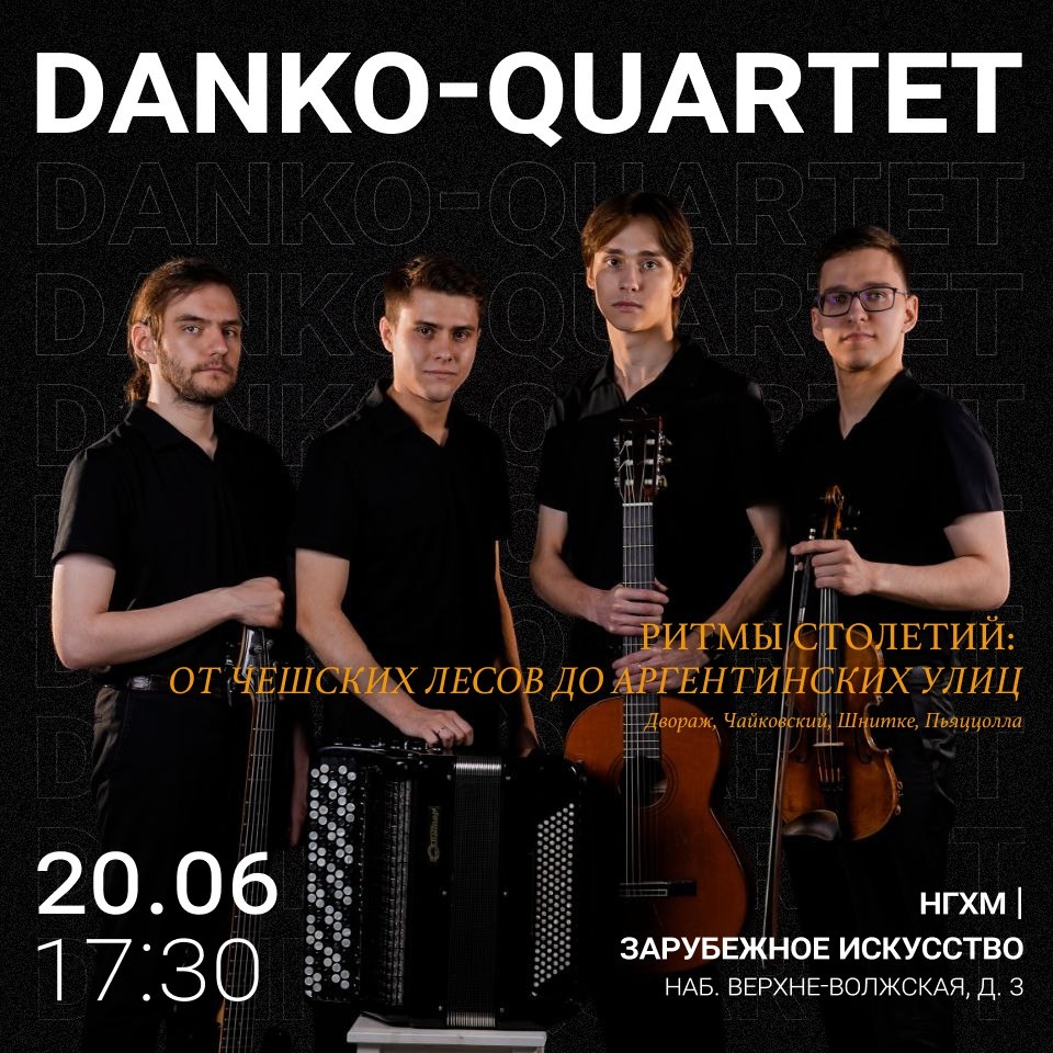 В ближайшую пятницу 20 июня в экспозиции картины Маковского «Воззвание Минина» прозвучит концерт ансамбля «Danko-Quartet» «Ритмы столетий: от чешских лесов до аргентинских улиц».